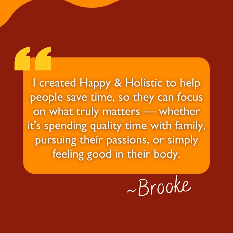 Brooke created Happy & Holistic as a way to simplify wellness for busy people. "As a busy individual myself, I know how hard it can be to prioritize health when you’re juggling a million things,” she says. Her mission with Happy & Holistic is clear: help people focus on what truly matters to them — whether that’s spending time with family, pursuing passions, or feeling good in their own bodies.