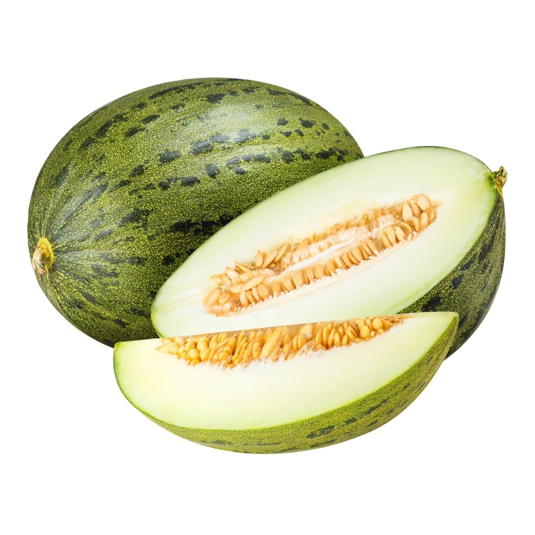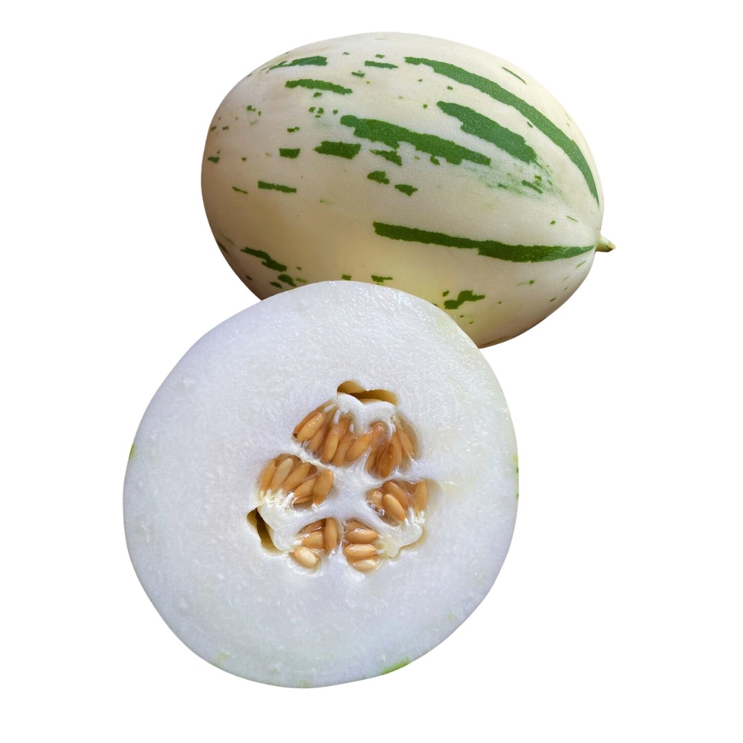 This French heirloom variety is well loved by eaters. Rich in flavor with a pleasant muskiness, this melon is known for being over-the-top aromatic. To check for ripeness, give this melon a good sniff. If its scent is sweet and robust, it’s ready to enjoy.