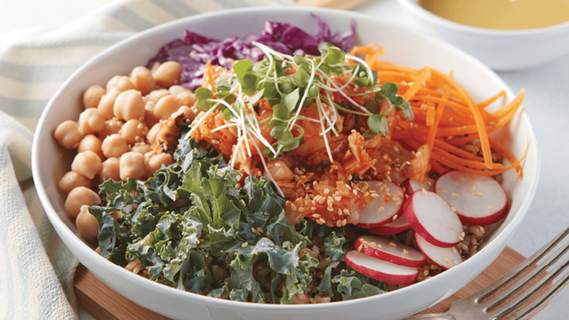 Divide the cooked grains between two wide, low bowls and spread evenly. Arrange the toppings in segments, with sauerkraut or kimchi and microgreens on top in the center.