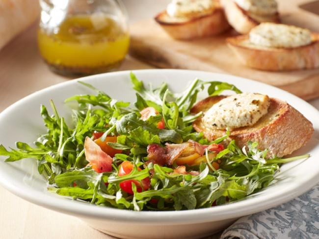 Bring the bistro home with a salad that evokes dining alfresco in Paris. A simple salad of arugula and tomatoes is tossed with an herby vinaigrette, and the warm, melted chèvre-topped baguette slices make this into a special meal.