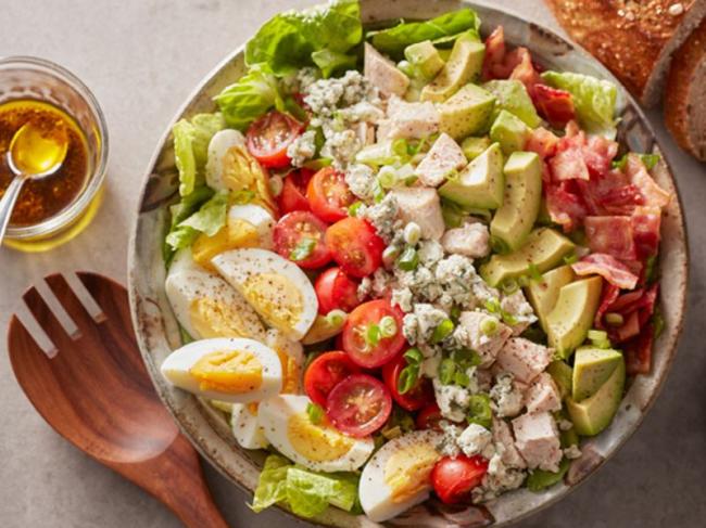 If you think salads are a little too light and leafy, try this classic Cobb. A bed of deep-green romaine peeks out from under rows of crispy bacon, boiled eggs, chopped chicken, blue cheese and avocado. An easy balsamic-Dijon vinaigrette ties it all together for a salad that eats like a meal.