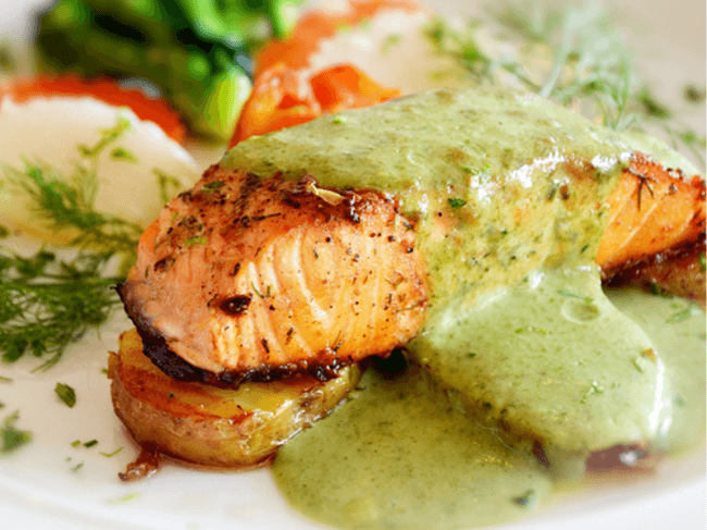 This spicy, robust, herb-based chermoula yogurt sauce atop baked salmon is simply divine.