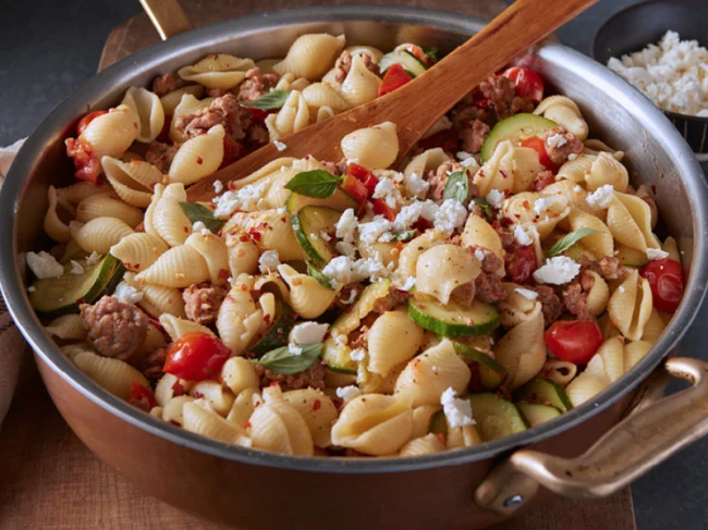 Italian sausage and fresh basil give this easy pasta dish tons of Italian flavor without a lot of effort for the cook. If you like a little heat, go with hot sausage, or if you prefer milder fare, use mild sausage and skip the red pepper flakes. Crumbled chevre adds creamy, tangy notes to contrast with the sweet and spicy sauce.