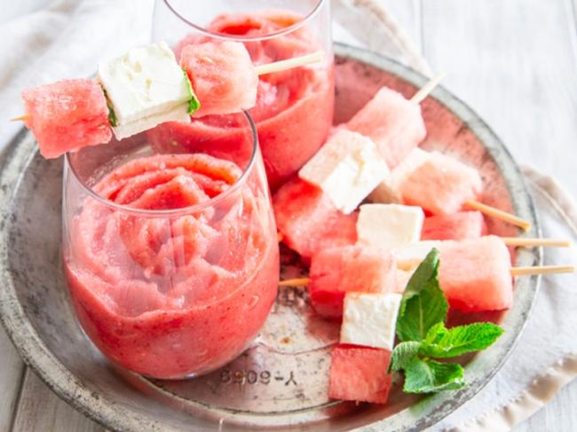 Craving more watermelon? Serve the frosé with a fun and easy appetizer—skewers of cubed watermelon and feta cheese drizzled with balsamic vinegar.